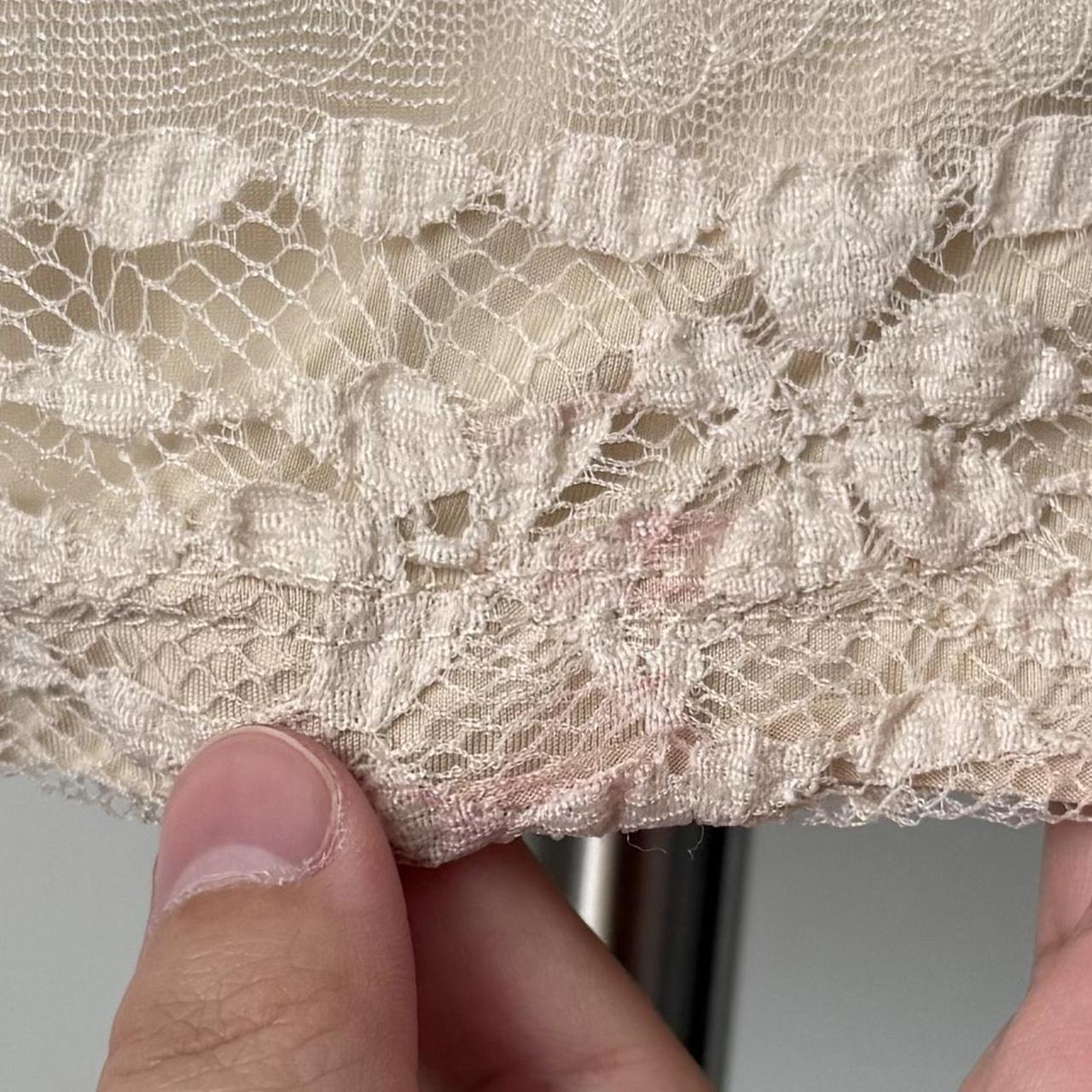 The lace has a patch that is stretched out in the front when not on. Pink stain on the hem
