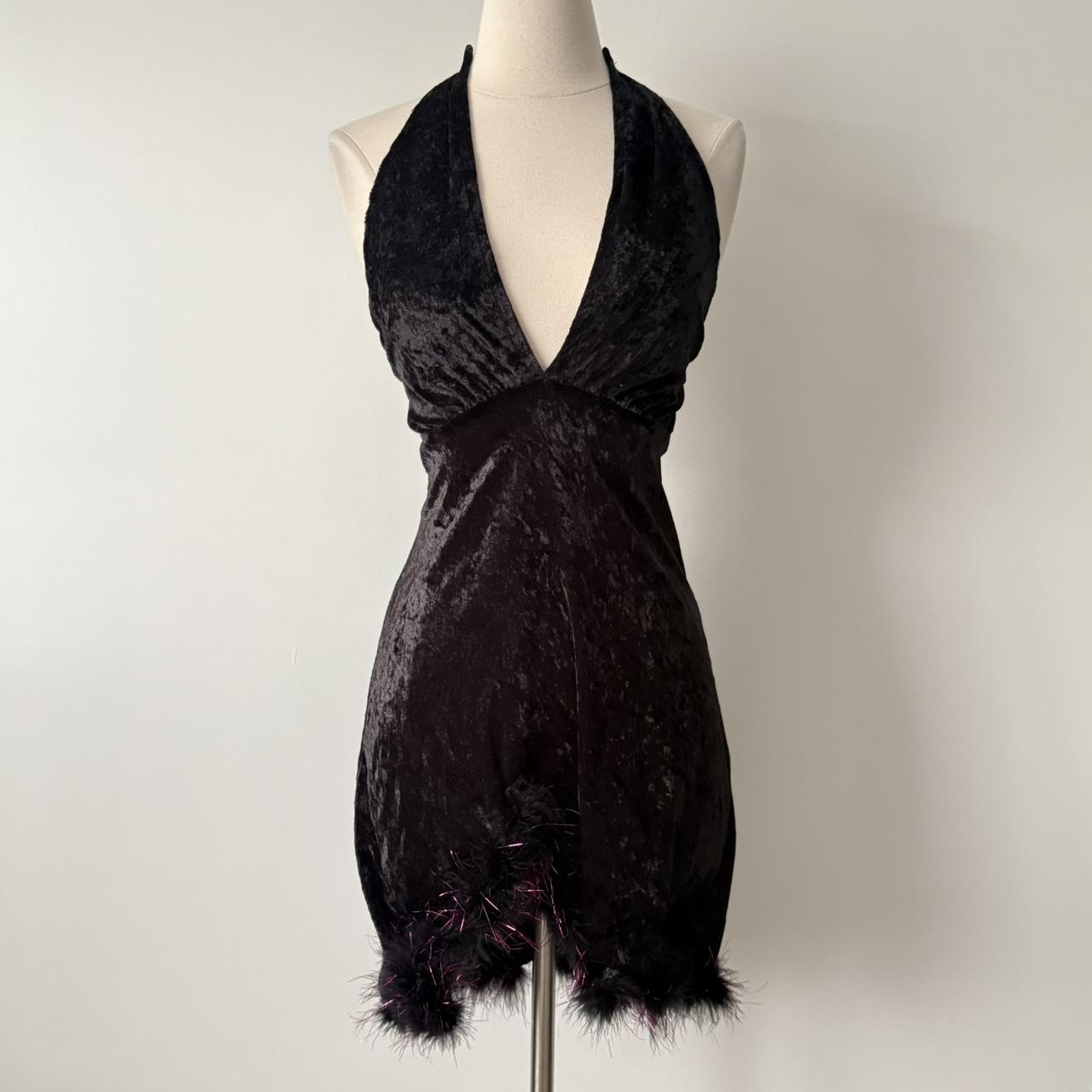 Asymmetric front that comes up a bit. Feather streamer trim at the bottom (bunched up a bit)